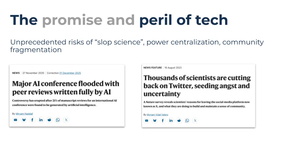On the other hand, they also bring unprecedented risks of “slop science”, power centralization, and community fragmentation.