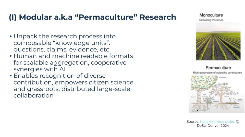Modular research, exemplified by initiatives like Continuous Science Foundation, Nanopublications and Discourse Graphs, is about unpacking the research process into machine readable, composable “knowledge units” like questions, claims, and evidence. Where traditional research has turned into a monoculture that recognizes only publications, modular research unlocks a new kind of “permaculture science” which recognizes diverse contributions, empowers citizen science and enables grassroots, distributed large-scale collaboration.