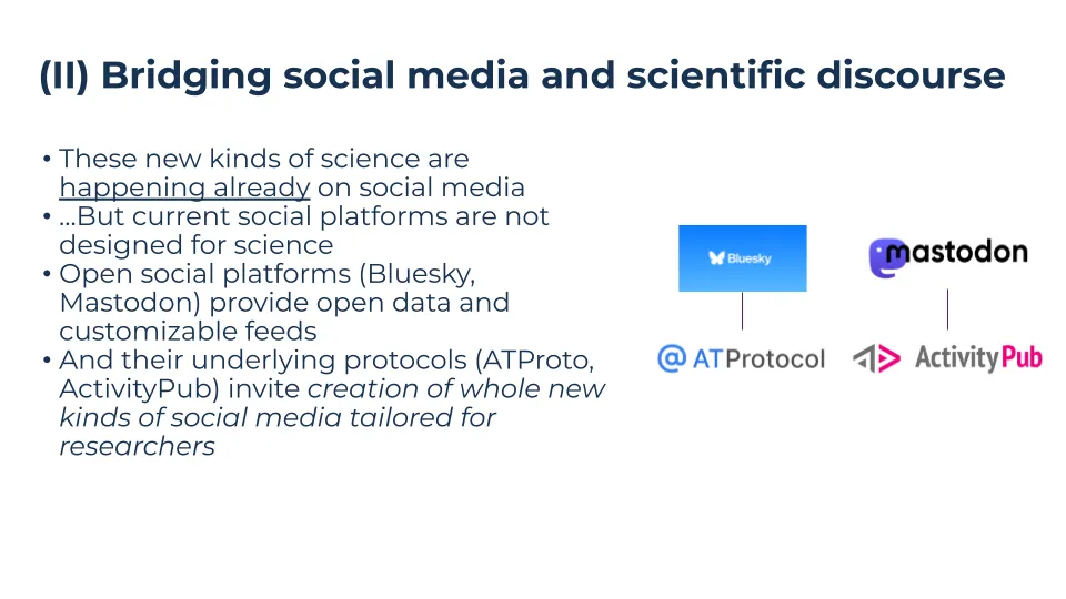 The good news is that we’re at a unique moment where open social networks like Bluesky are seeing huge popularity gains with scientists. And we can go even further than that - open platforms are built on open protocols like ActivityPub and ATProtocol, which are inherently extensible and enable the creation of whole new kinds of social media tailored for research. When effectively federated, these protocols and tools have the potential to unlock new forms of participation and knowledge sharing that doesn’t happen on traditional platforms.